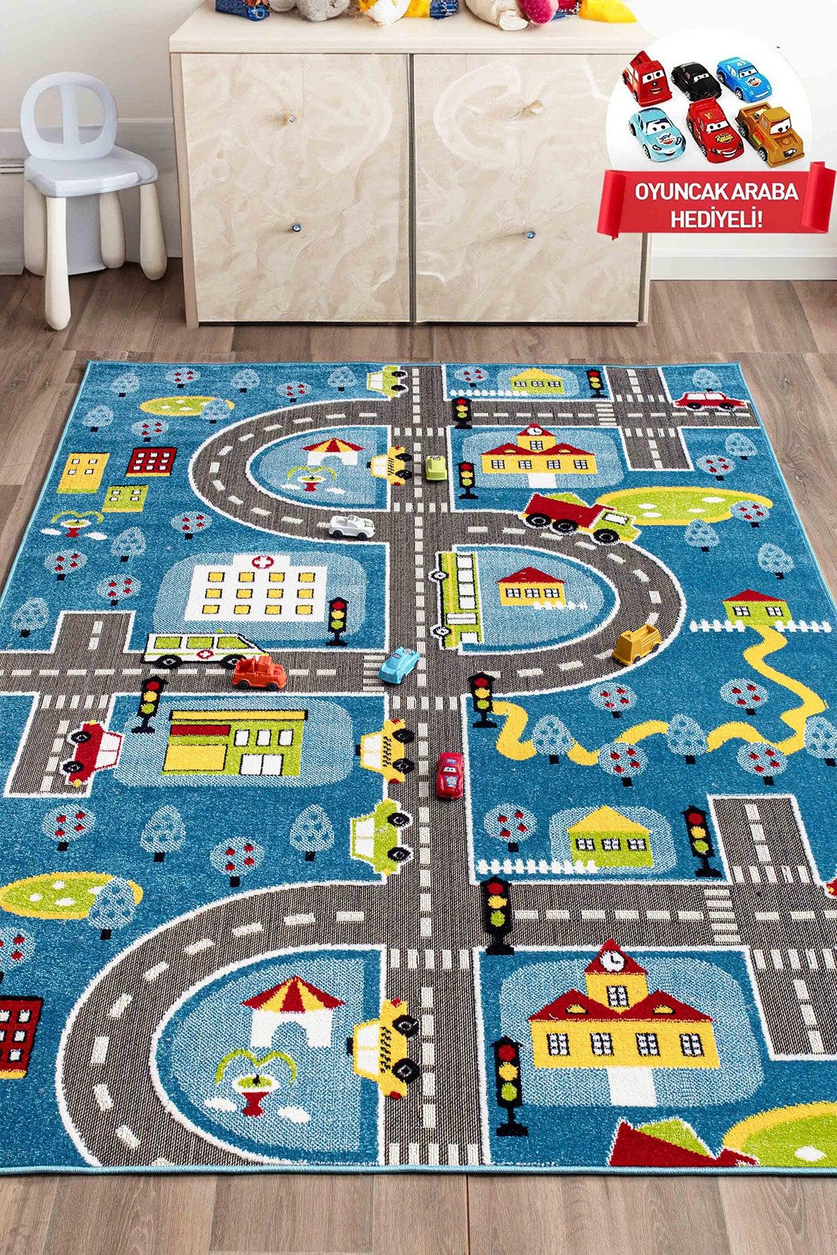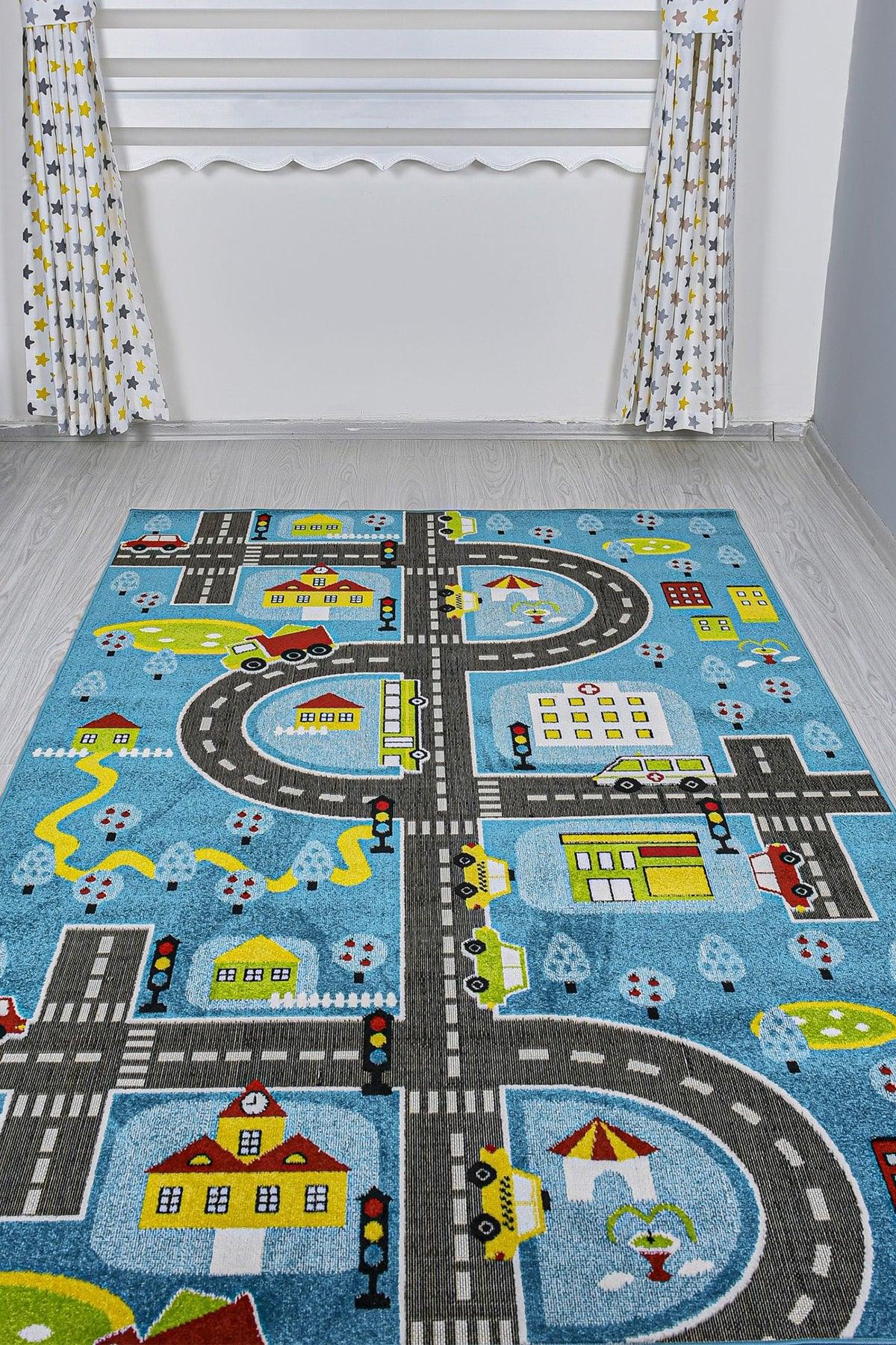 Anaokulu Kreş Oyun Halısı 3 Boyutlu Dokuma Mavi Trafik