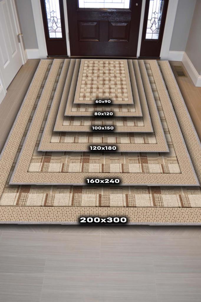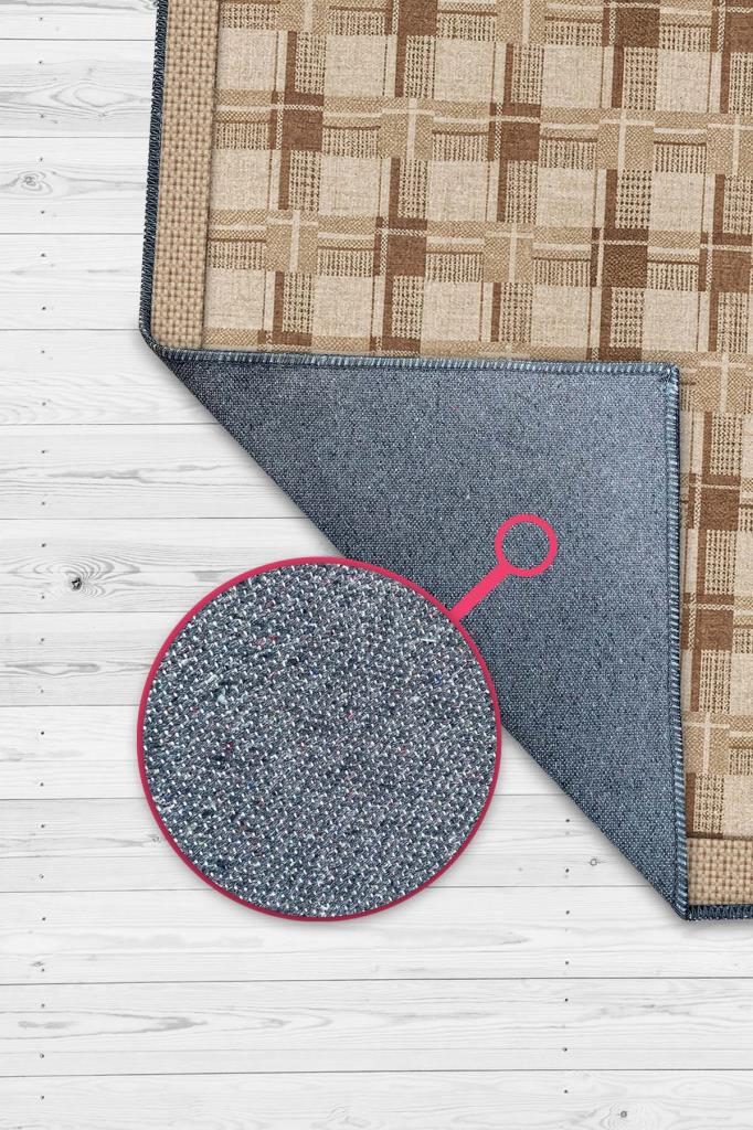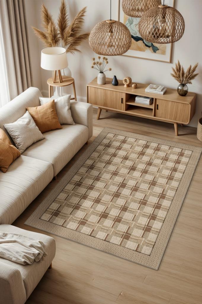Ekose Desenli Hasır Renkli Oturma Odası Halısı, İskoç Etnik Desenli Salon Halısı, Fındık Renkli Yıkanabilir Kareli Halı