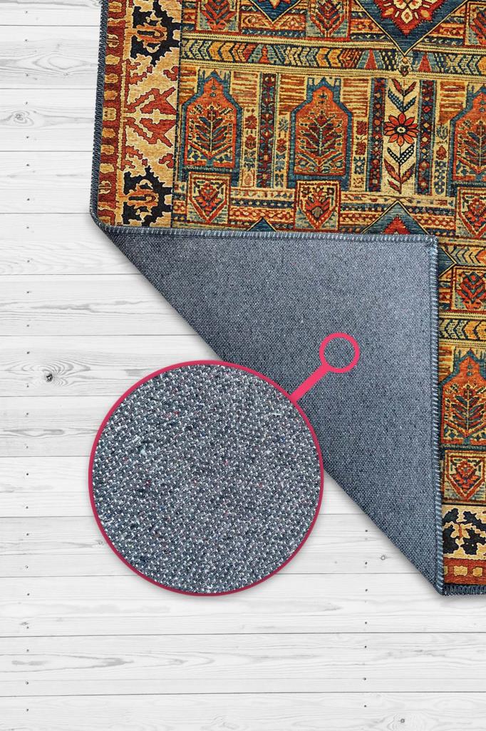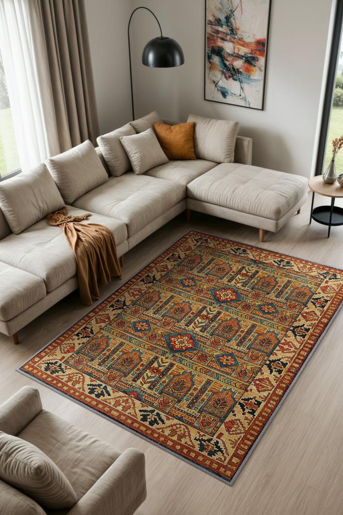 Etnik Kafkas Desenli Geleneksel Rustik Halı, Yıkanabilir Oturma Odası Halısı