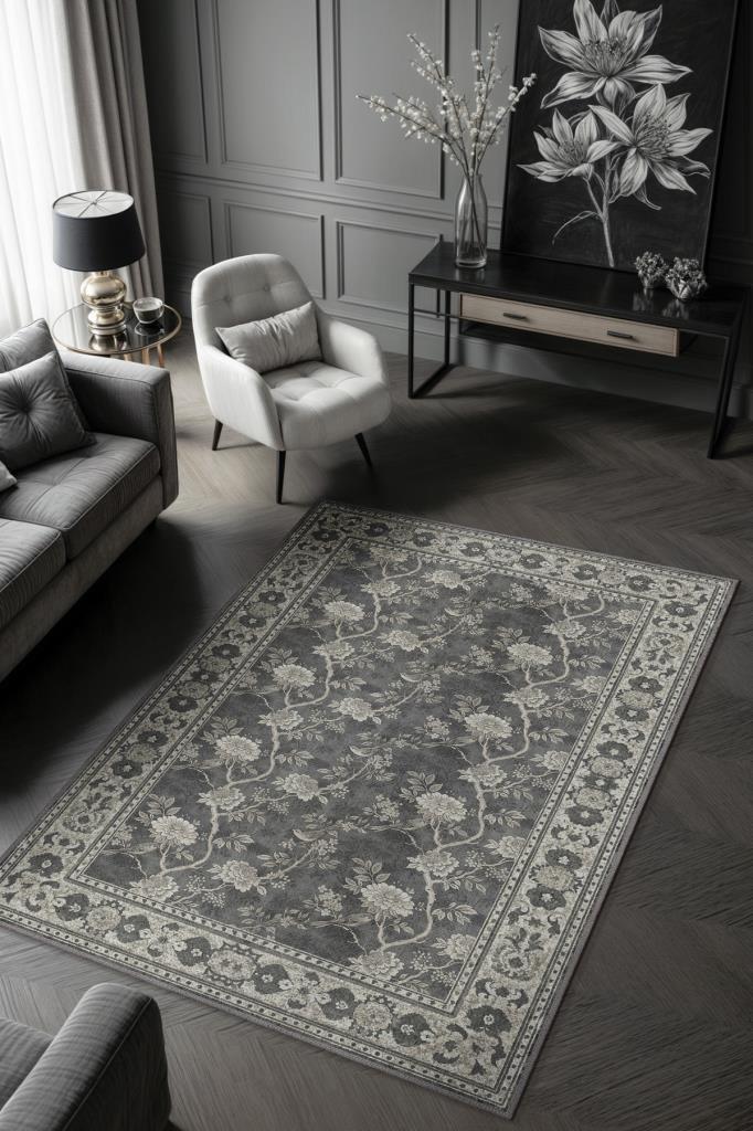 Gotik Dekor Tarzı Çiçekli Gri Yatak Odası Halısı, Yıkanabilir Gri Oturma Odası Halısı
