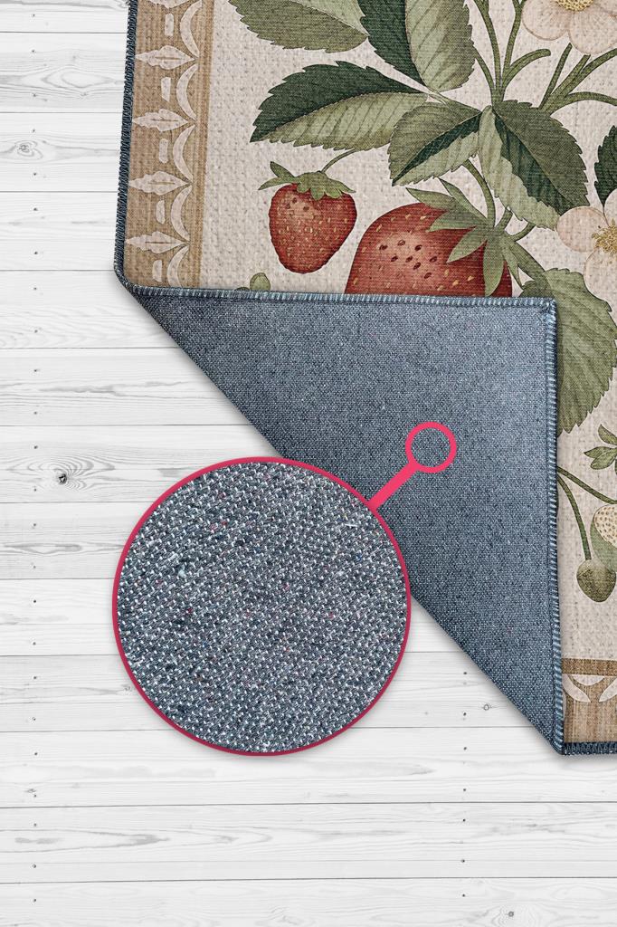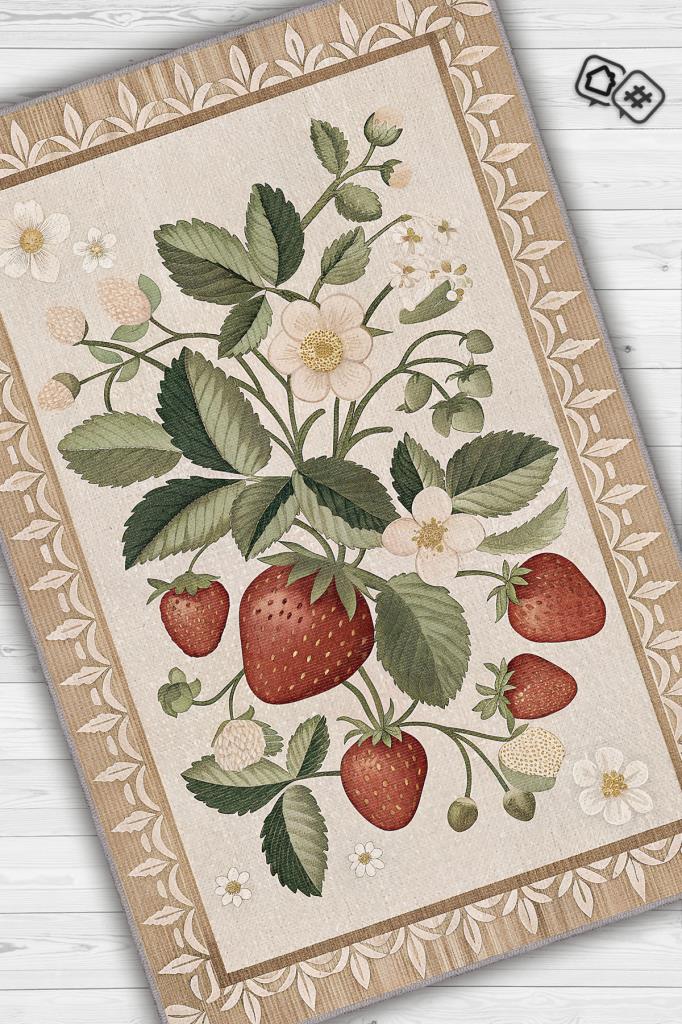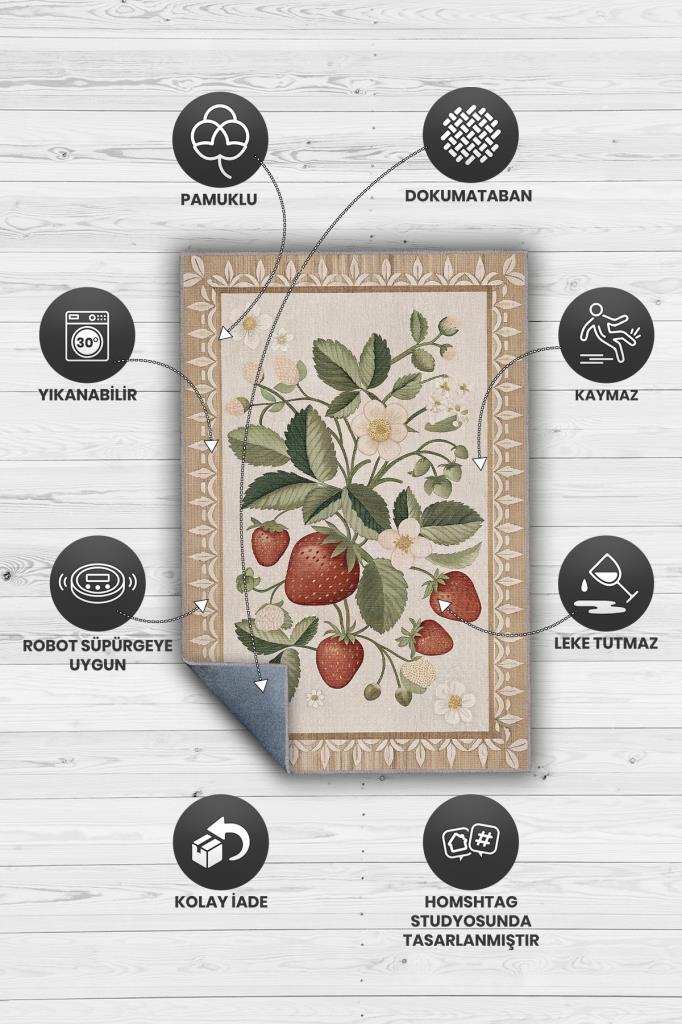Homshtag Art Deco Çilek Desenli Halı Bitki Temalı Krem Renk Modern Çilek Desenli Dijital Baskı Halı