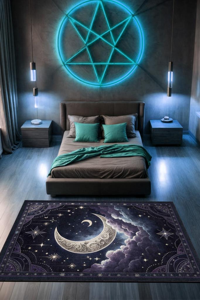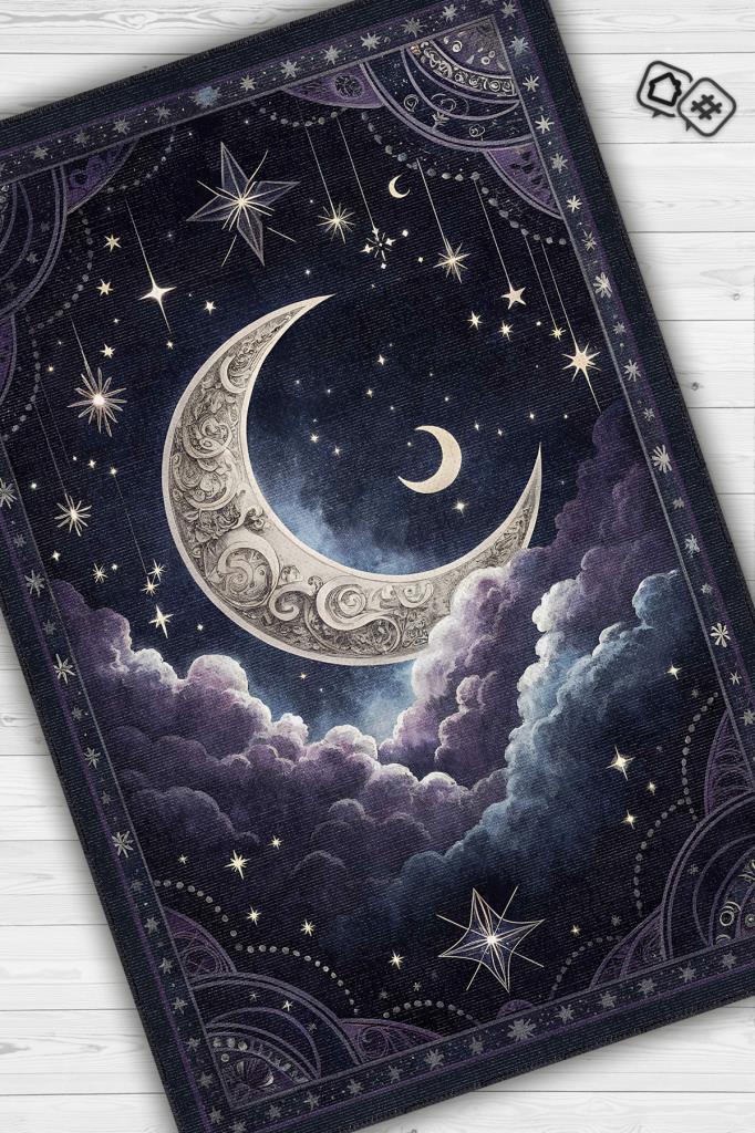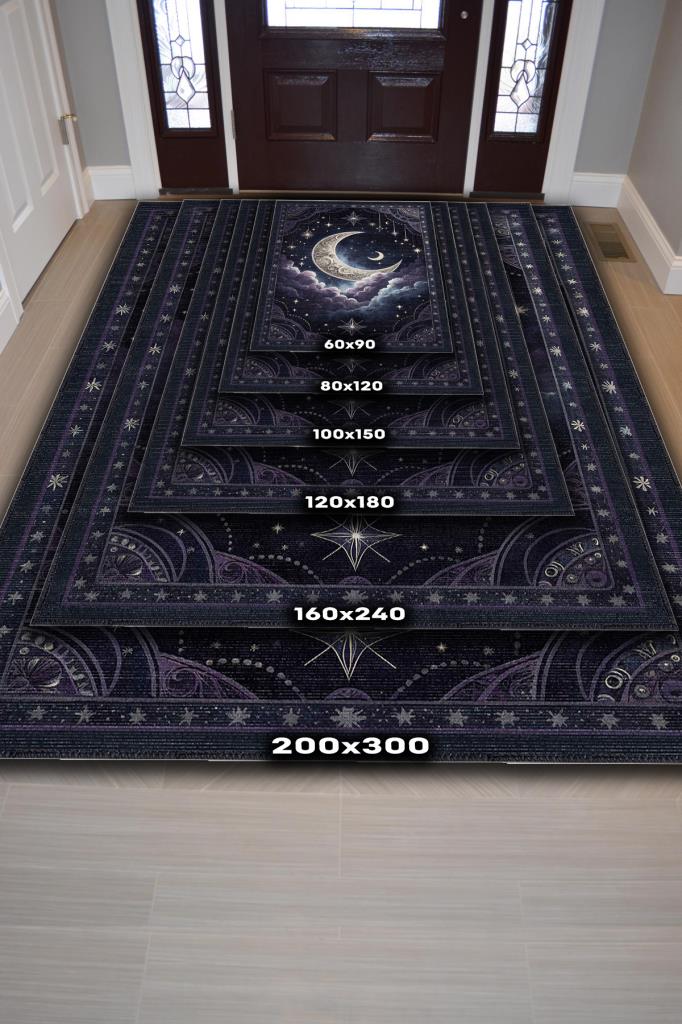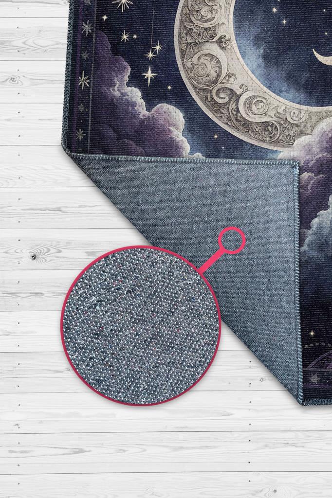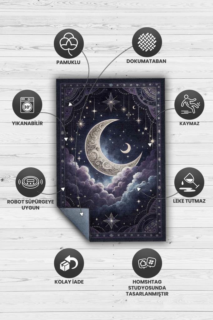 Homshtag Ay ve Bulut Temalı Halı Siyah Renk Oturma Odası Halısı Ay Yıldız Figürlü Dijital Baskı Halı