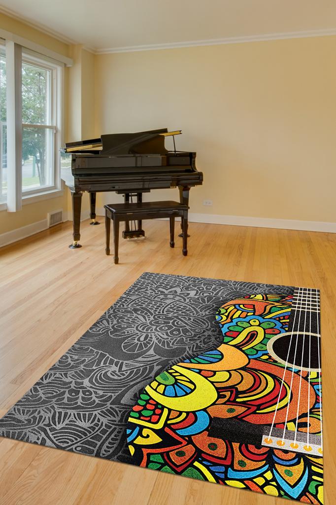 Homshtag Gitar Renkleri Gri Çok Renki Halı Etnik Desenli Müzik Sever Halısı Gitar Desenli Halı