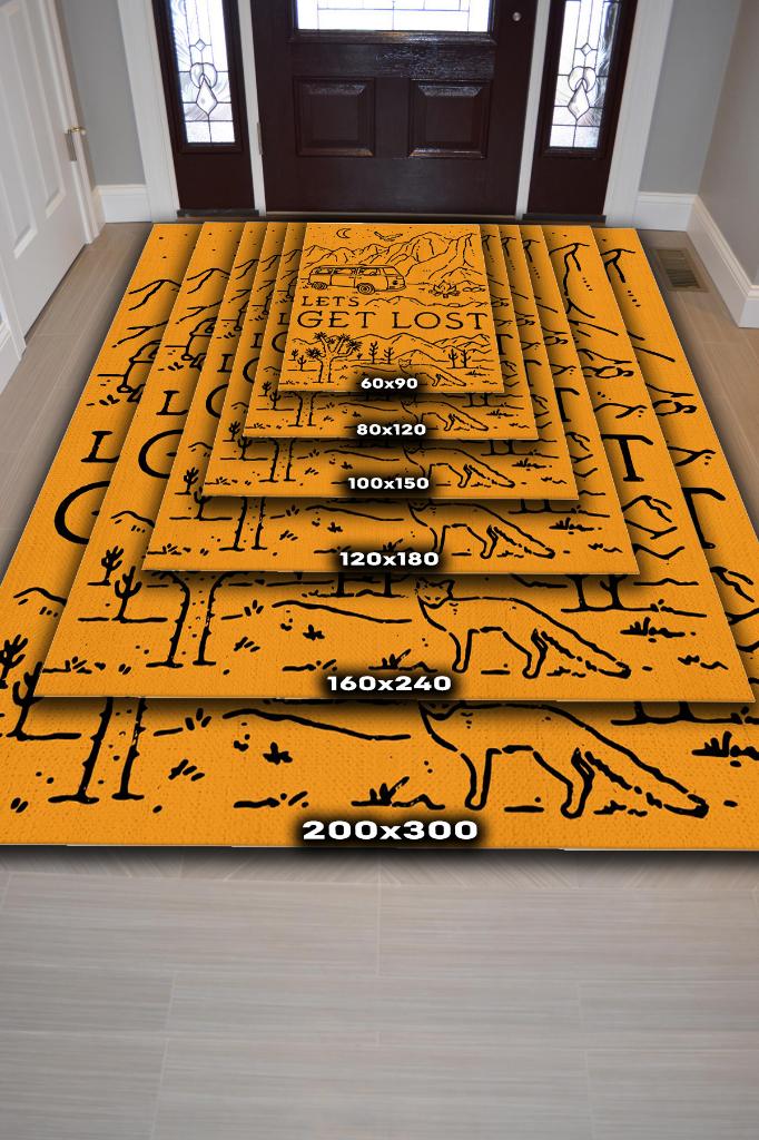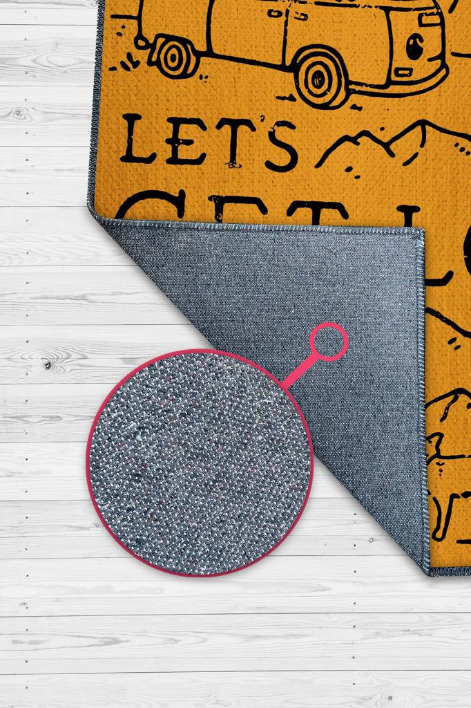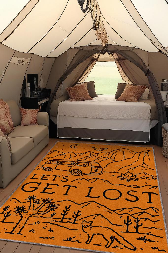 Homshtag Kaybolalım,Seyahat Temalı Sarı Halı,Çadır Halısı,Kamp Halısı,Pamuklu Dokuma Tabanlı Yıkanabilir Dekoratif Halı
