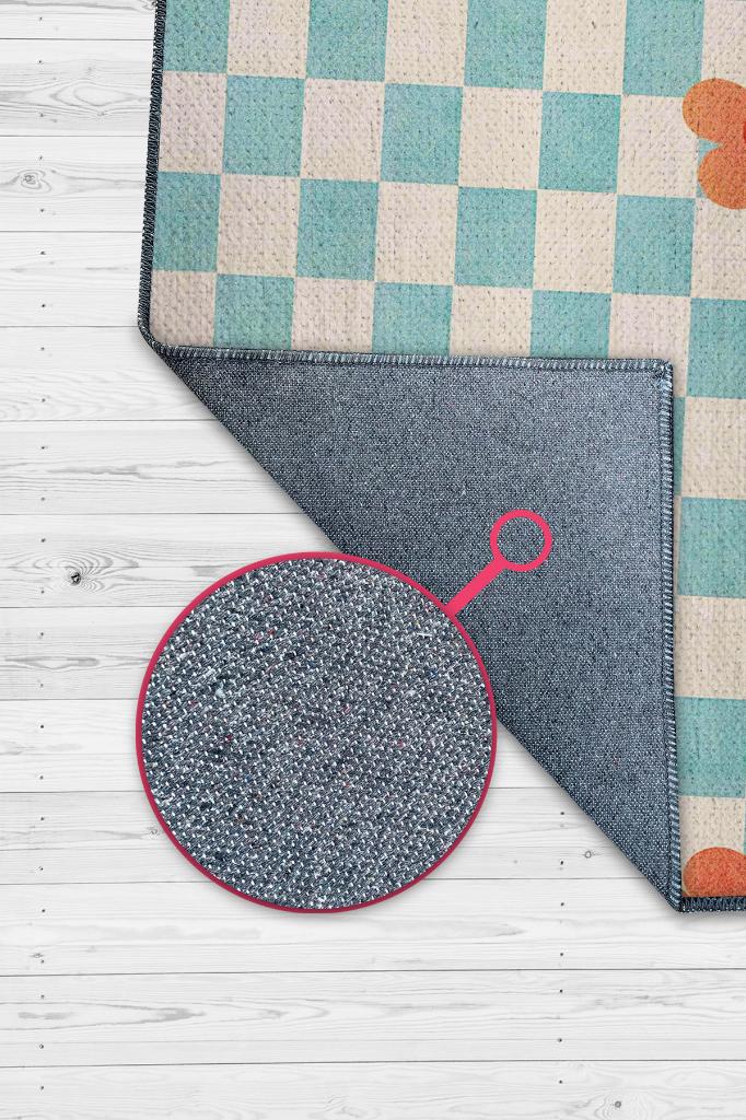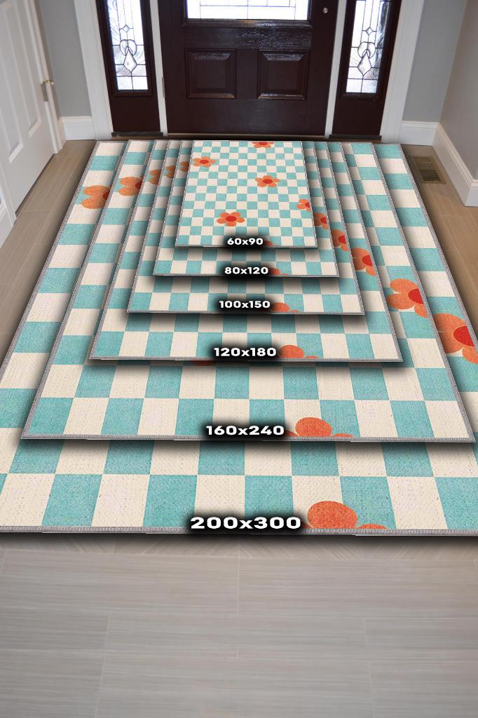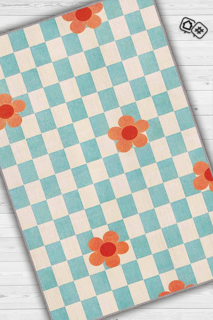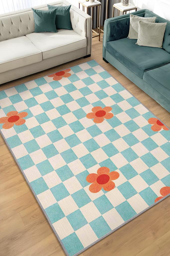 Homshtag Umut Geometrik Halı Çiçek Desenli Salon Halısı Mavi Renkli Oturma Odası Halısı Kareli Halı