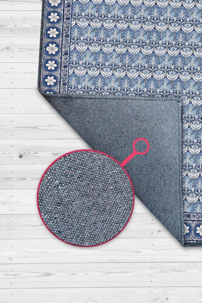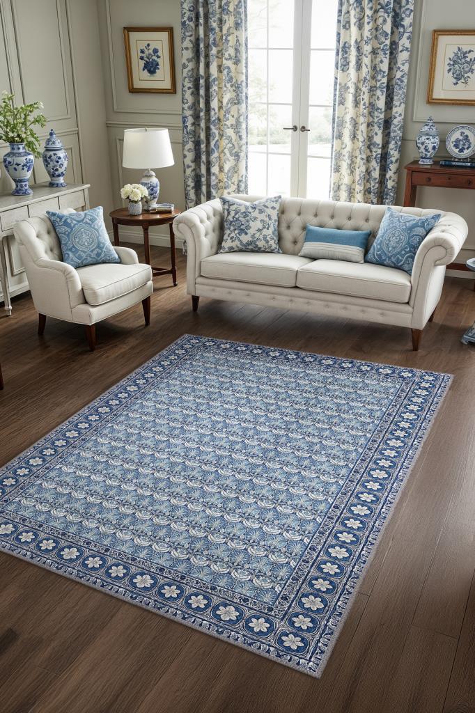 Klasik Porselen Desenli Çiçekli Mavi Salon Halısı, Mavi Oturma Odası Halısı, Çini Desenli Yıkanabilir Halı