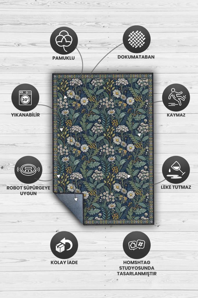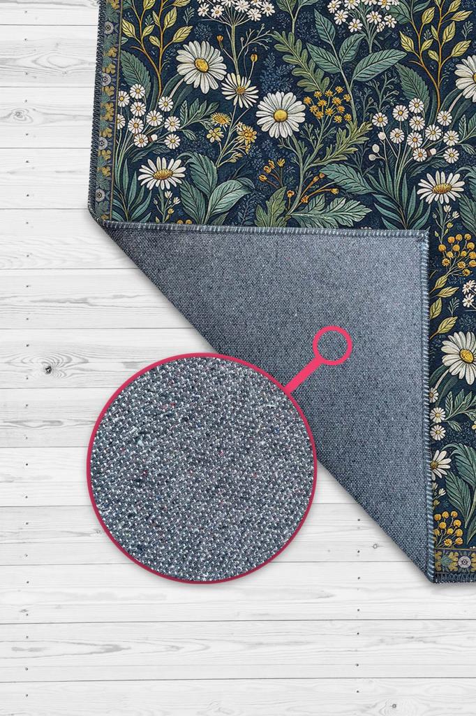 Koyu Renkli Çiçekli Maksimalist Halı, Papatya Bahçesi Temalı Oturma Odası Halısı, Huzur Verici Oda Dekoru