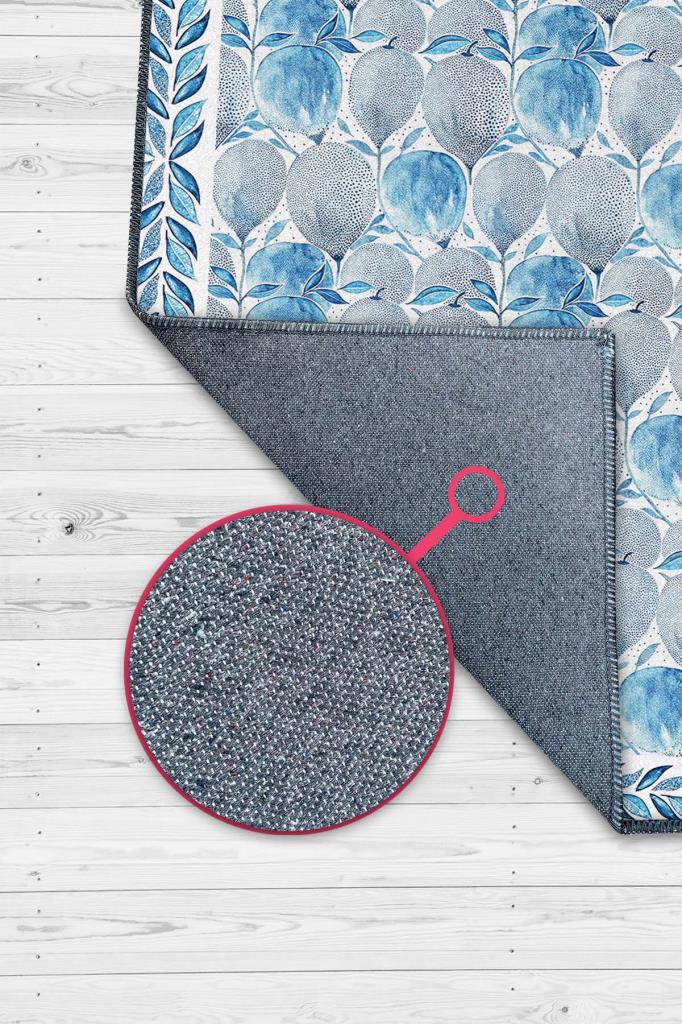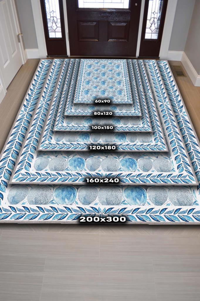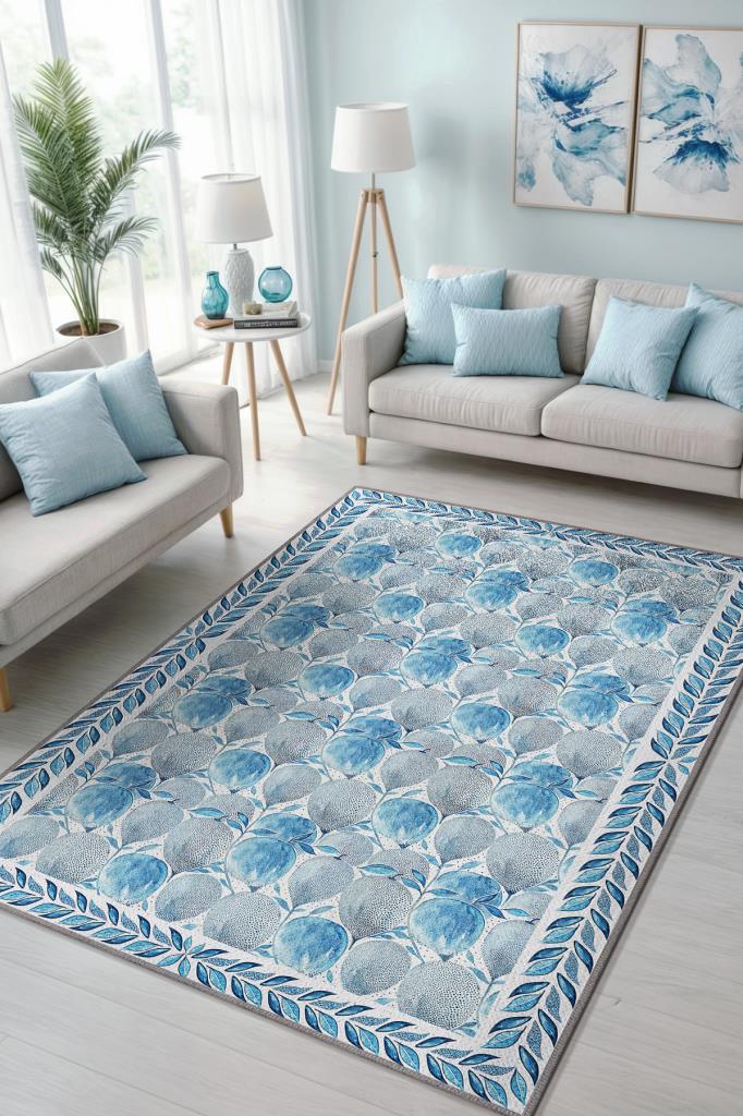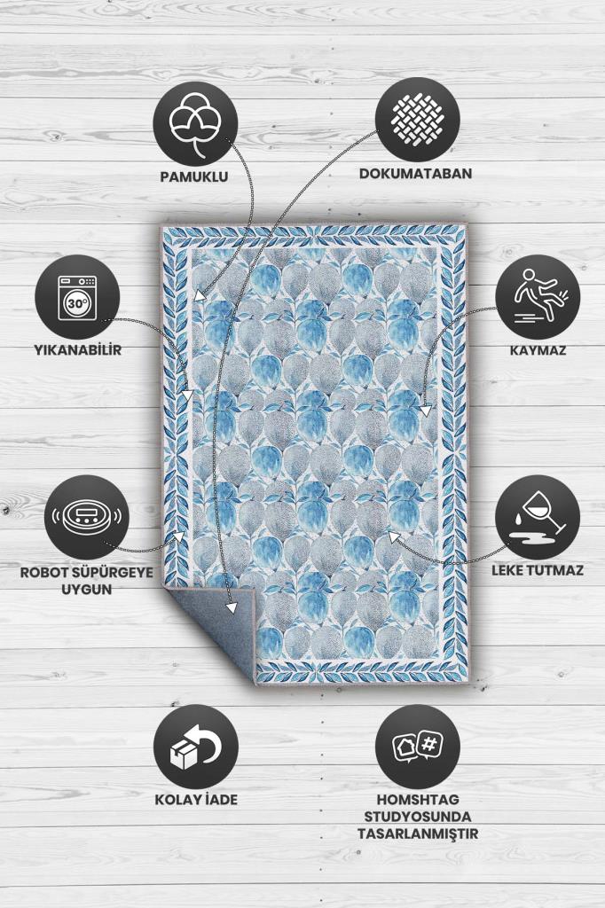 Pastel Mavi Botanik Bohem Halı, Çiçek Desenli Salon Halısı, Yıkanabilir Dokuma Pamuk Tabanlı Kaymaz Tabanlı Halı