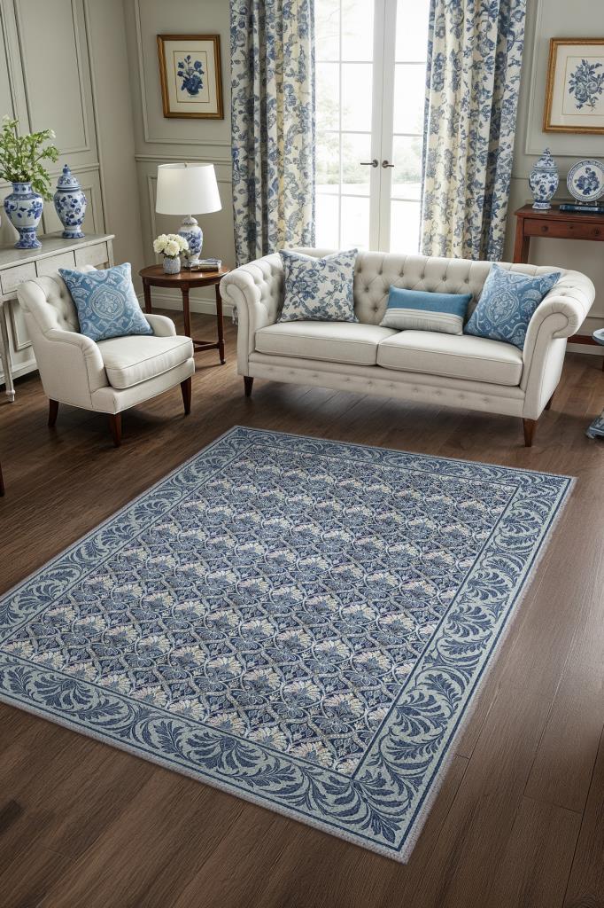 Yaprak Motifli 19.Yüzyıl Temalı Mavi Lacivert Halı, Yıkanabilir Oturma Odası Halısı, Klasik Salon Halısı