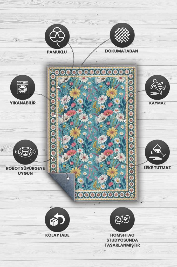 Yıkanabilir Dokuma Pamuk Tabanlı Kaymaz Tabanlı Çiçekli Mavi Salon Halısı, Maksimalist Ev Dekoru, Yıkanabilir Halı